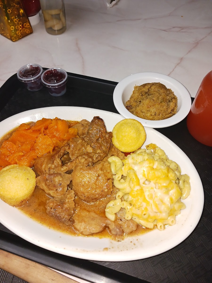 Fried Chicken Wings Yams Macaroni and Cheese and Corn Bread